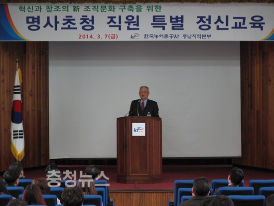 한국농어촌공사 충남지역본부(본부장 홍성범) 는 7일 오후 대강당에서 150여명의 충남도내 직원이 참석한 가운데 강인덕 前 통일부 장관을 초청 '통일을 준비하자'라는 주제의 특강을 실시했다.