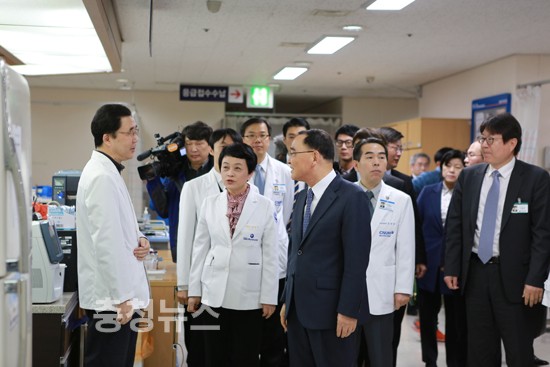 정홍원 국무총리가 대한의사협회 차원의 집단 휴진 사태가 발생한 것과 관련, 10일 오전 충남대학교병원(원장 김봉옥)을 방문 의료현장을 찾아 비상진료체계 상황 등을 점검했다.