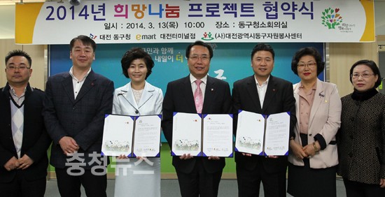 대전 동구(구청장 한현택)는 13일 구청 소회의실에서 이마트 대전터미널점(점장 박찬신), 동구자원봉사센터(센터장 이민표)와 지역의 어려운 이웃을 돕기 위해 상호 협력키로 하고 ‘희망나눔 프로젝트’ 협약을 체결했다.