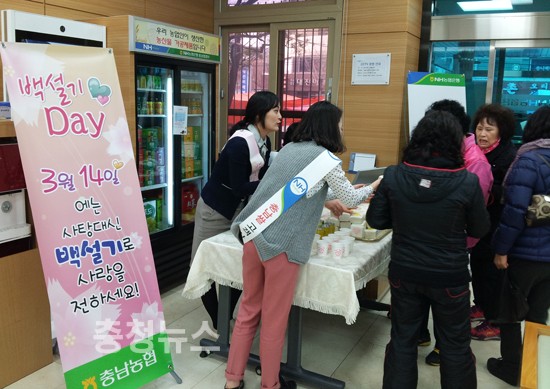 농협중앙회 충남지역본부(본부장 김병문)는 지난 14일 젊은이들의 기념일인 ‘화이트 데이’에 맞춰 사탕 대신 우리 고유 음식인 백설기 떡을 나눠주는 ‘백설기 데이’ 행사를 가졌다.