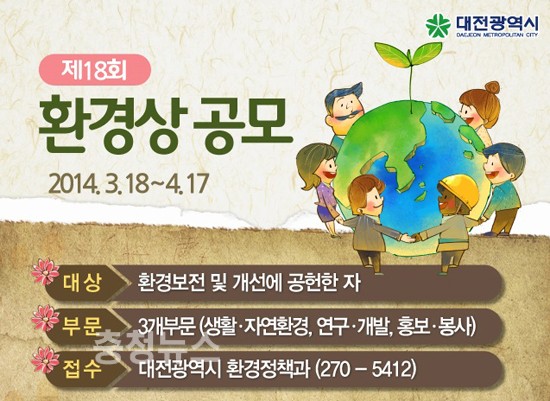 대전시는 2014년 환경의 날(6월 6일)을 맞아‘2014년 대전광역시 환경상’ 수상후보자를 공모한다.