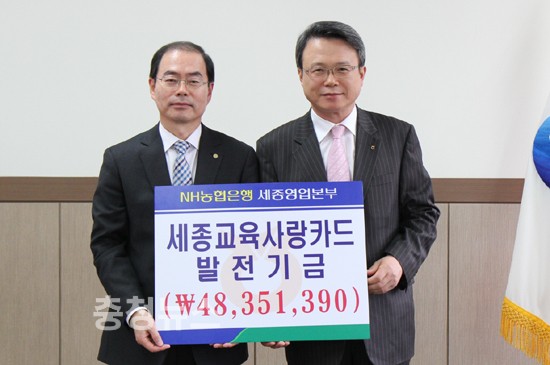 세종특별자치시교육청(교육감권한대행 부교육감 전우홍)은 19일 NH농협은행 세종영업본부(본부장 이창현)로부터 지난 해 세종교육사랑카드 사용으로 적립된 기금 4800여만원을 전달받았다고 밝혔다.