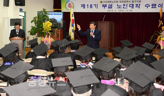 대전시 중구(구청장 박용갑)는 19일 대한노인회 중구지회 강당에서 136명의 노인대학생에 대한 ‘제16기 노인대학 수료식’을 열었다.