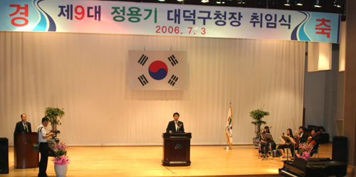정 대덕구청장은 이날 취임사를 통해 "이번 선거 결과는 침체와 낙후라는 대덕의 현주소에서 변화와 개혁의 새 지평을 향하여 보무(步武) 당당히 진력하라는 22만 구민의 준엄한 심판이었다고 확신한다"며 "이 자리에 세워주신 소중한 뜻을 받들어 구민의 작은 목소리에도 귀 기울이는 신문고 구청장이 되겠다"고 강조했다.