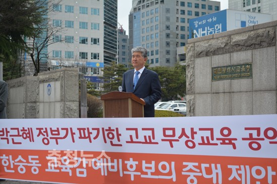한숭동 대전시교육감 예비후보는 25일 고교 무상교육 실행을 위한 기자회견을 열고 "박 정부의 교육 공약이 현재까지 제대로 이행되지 못해 실망을 사고 있다"며 "당장의 현실 가능한 정책에 대해서 많이 고민해왔다"고 밝혔다.