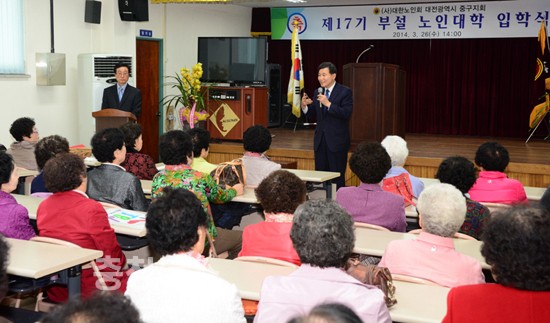 대전시 중구(구청장 박용갑)는 26일 오후2시 대한노인회 중구지회 강당에서 박용갑 중구청장과 (사)대한노인회 중구지회 송난영 회장, 노인대학 입학생 125명 등 관계자들이 참석한 가운데 ‘제17기 노인대학 입학식’을 가졌다.