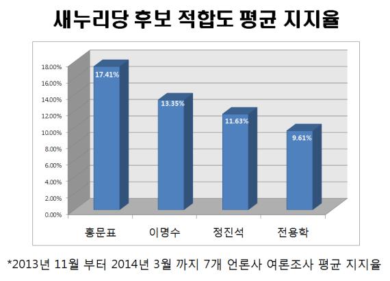 새누리당 홍문표 충남도지사 경선후보자는 28일 보도자료를 통해 지난해 9월16일부터 최근까지 지역 언론사 및 중앙언론사에서 실시한 일곱 번의 여론조사에서 홍문표 경선후보자가 새누리당 충남도지사 적합도에서 압도적 1위를 하고 있는 것으로 나타났다고 밝혔다.