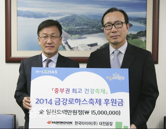 한국타이어 대전공장 이기영 공장장은 지난 2일 대덕구청 구민의 사랑방에서 2014 금강로하스축제 후원금으로 1500만원을 전달했다.