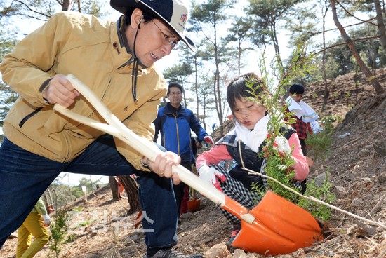 충남도는 제69회 식목일을 하루 앞둔 4일 홍성군 장곡면 산성리에서 안희정 지사, 김석환 홍성군수, 도와 홍성군 공무원 등 300여명이 참석한 가운데 나무심기 행사를 가졌다.