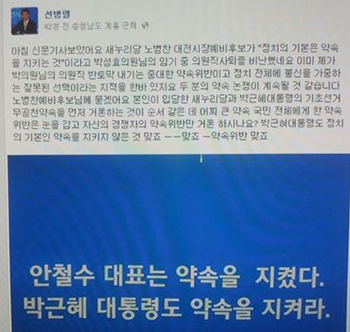 선 후보는 또한 “박성효 의원의 의원직 반토막 내는 중대한 약속위반이고 정치 전체에 불신을 가중시키는 것”이라며 “두 분의 약속 논쟁이 계속 이어져 갈 것”이라고 주장했다.