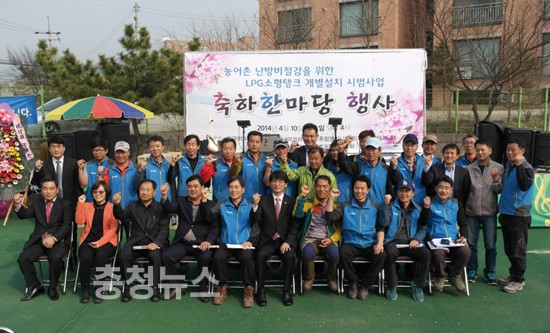 ▲ 천안시 서북구 성거읍 복지회관에서 지난 10일 오후 LP가스 소형벌크 보급 시범사업 준공식을 겸한 축하행사가 열린 가운데 새정치민주연합 박완주 의원(천안을)을 비롯한 벌크협의회 관계자들이 기념촬영을 하고 있다.