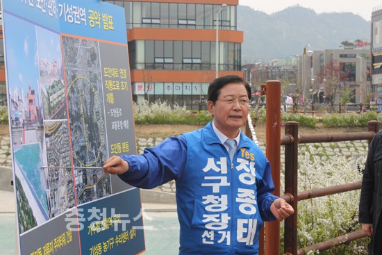 새정치민주연합 장종태 서구청장 예비후보는 11일 관저동 저류지 앞에서 가수원․도안․관저․기성 권역의 지역공약을 발표했다.