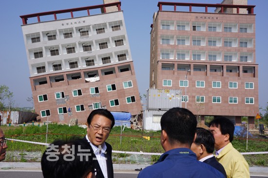 새누리당 정진석 충남도지사 후보는 13일 아산시 둔포면 아산테크노밸리산단내 오피스텔 붕괴위기 현장을 방문했다.