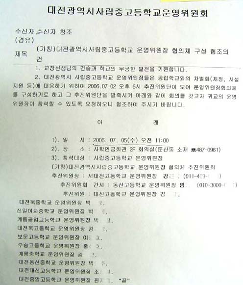일부 언론에 보도된 바와 같이, 현 서대전고등학교 교장이자 대전광역시공사립중등교장단장인 오○○씨는 이번 7.31 교육감재선거 출마예정자인데 서대전고교의 운영위원장인 강○○씨(아래 ‘협의체’ 추진위원장)는 (가칭)‘대전광역시사립중고등학교 운영위원장 협의체’ 구성에 협조해 달라는 공문을 대전지역 모든 사립 중·고등학교에 보냈다.