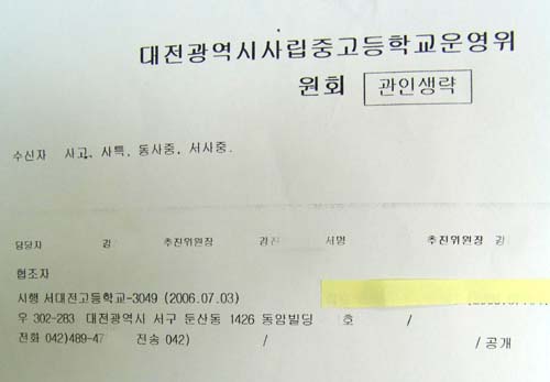 이런 상황에서 후보 단일화에 찬성했던 것으로 알려진 오○○씨가 속한 서대전고등학교측에서 교육청 행정망인 전자문서시스템을 이용해 버젓이 ‘대전광역시사립중고등학교 운영위원장 협의체’ 구성 협조 공문을 보냈다니 믿기지 않는다. 나아가 경악을 금치 못한다. 오○○씨는 교육감 출마 예비후보이고, 제1선거구 교육위원 출마 예정자 손○○씨는 협의체 추진위원회 간사가 소속된 동산고등학교 학교장을 역임한 바 있다. 오○○씨와 손○○씨는 서로 제부-처형 사이다.