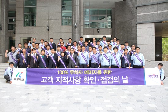 (주)금성백조는 20일 도안신도시 7블록 예미지 현장에서 입주자 사전점검 결과에 따른 2차 예미지케어를 진행했다. 도안신도시 7블록 예미지는 지난 4월 26일 임직원들이 직접 세대 내부를 점검해 체크하는 1차 예미지 케어를 시행했고, 지난 5월 9일부터 12일까지 입주예정자들이 직접 개인 세대의 사전 점검을 실시한 바 있다.