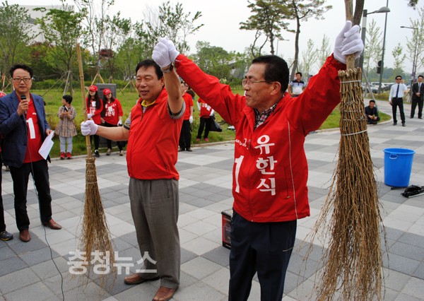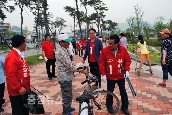 ▲ 최민호 前 청장, 유한식 시장 후보와 손잡고 중앙공원 정화 행사에 나섰다.