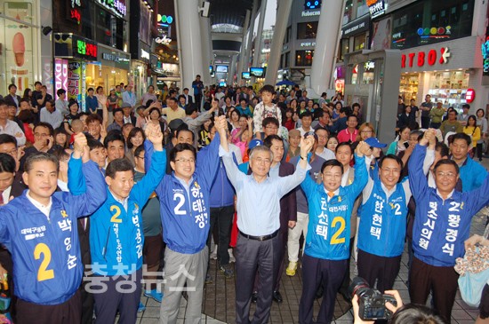 ▲ 문재인 국회의원, 권선택 대전시장 후보, 허태정 유성구청장 후보, 김종천 시의원 후보, 강래구 동구 위원장과 이서령 중구 위원장