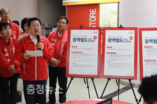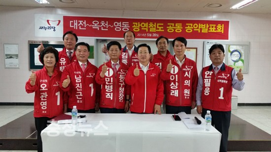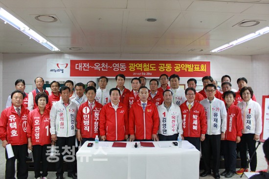 대전-옥천간 광역철도망 구축 사업이 한층 탄력을 받게됐다. 새누리당 이장우 의원(대전 동구)과 박덕흠 의원(충북 보은‧옥천‧영동), 민병직 동구청장 후보 등은 28일 대전 판암역에서 ‘시.도 공동정책협약식’을 갖고 광역철도망 구축사업을 강력히 추진키로 했다.