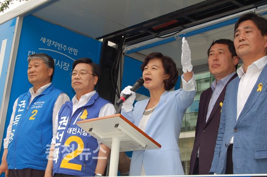 새정치민주연합 추미애 국회의원이 1일 대전을 방문, 대전복합터미널 앞에서 권선택 대전시장 후보 지원 유세에 나섰다. 추 의원은 “중앙권력이 한쪽에 가있다면 지방권력은 균형을 맞춰서 대한민국호가 안전하게 항해할 수 있도록 만들어줘야 한다”며 “기호 2번 권선택을 선택해서 대한민국 안전항해를 담보할 수 있도록 여러분이 지지해 달라”고 목소리를 높였다.