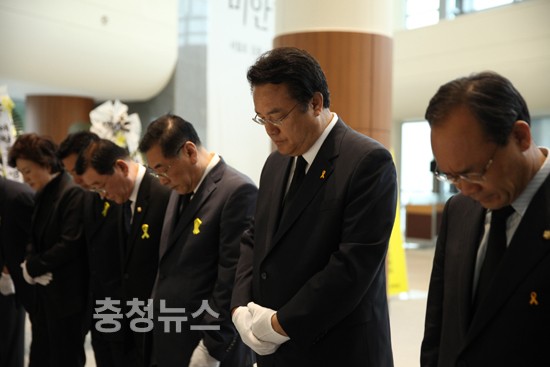 정진석 새누리당 충남도지사 후보는 3일 오전 충남 홍성 내포신도시 충남도청 1층 로비에 마련된 ‘여객선 세월호 침몰사고 희생자 합동분향소’를 찾아 49재를 맞은 희생자들의 넋을 위로하고 분향했다.