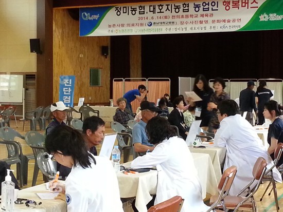 농협중앙회 충남지역본부(본부장 김병문·이하 충남농협)은 지난 14일 당진시 정미면 천평로 소재 천의초등학교 체육관에서 충남대학교병원 의료진과 봉사단 80명이 참여해 정미농협, 대호지농협 농업인 500여명을 대상으로 무료진료 및 고령농업인 장수사진촬영 등 농촌복지 종합서비스를 실시했다.