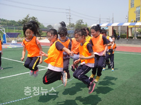 ▲ 연기도원초 학생들이 학교 스포츠클럽 종목 중의 하나인 단체줄넘기 연습을 하고 있다.