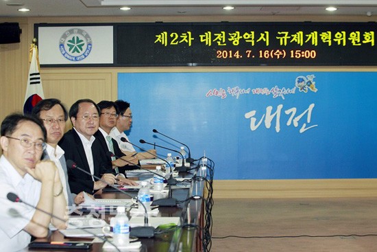 대전시는 16일 오후 류순현 행정부시장 주재 2014년 제2차 규제개혁위원회를 개최, 자치법규 등록규제 20% 감축 추진상황 보고, 규제개혁신문고과 지방규제신고센터에 접수된 기업애로 규제 7건을 안건으로 상정ㆍ심의 했다.