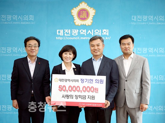 대전시의회 (의장 김인식) 정기현 의원은 17일 오후 대전시의회 4층 대회의실에서 대전사회복지공동모금회(회장 안기호)에 우리 지역의 장애인 및 사회적 배려대상 학생들을 위한 장학금으로 써달라며 5,000만원을 기탁했다.