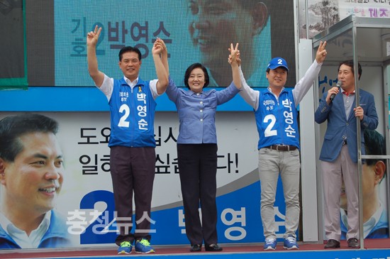새정치민주연합 박영선 원내대표가 28일 대전 대덕 국회의원 보궐선거 막바지 총력전에 나섰다. 박 원내대표는 이날 오후 대전을 방문, 신탄진역 앞에서 박영순 후보 지원유세를 펼치며 “도시철도 2호선을 반드시 신탄진까지 연장되도록 지원하겠다”고 강조했다.