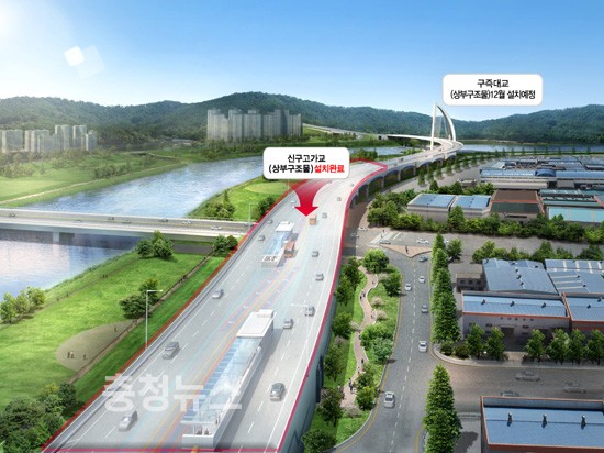 갑천을 횡단하는 구즉대교와 연결되는 신구고가교는 총 길이 526m, 각 기둥과 기둥사이는 50m, 상부 바닥판을 지지하는 상부구조물(IPC Girder)은 총 125본으로 구성되는데, 28일 마지막으로 22본의 상부 구조물을 성공적으로 설치하였다.