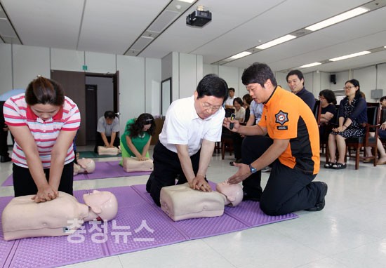 장종태 구청장은 11일 직접 심폐소생술 교육에 참여해 제8기 교육생과 함께 심폐소생술 과정을 이수하고, 교육 후에는 직원들과 대화를 통해 안전에 대한 소통과 공감대 형성에 나섰다.