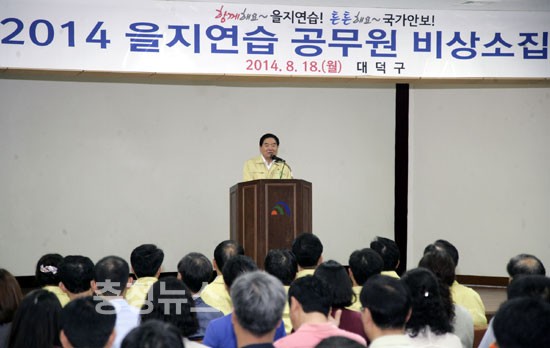 대전 대덕구(구청장 박수범)는 18일 오전6시 발령된 전직원 비상소집에 휴직·파견자 등을 제외한 602명이 응소한 가운데, 구청 민방위교육장에서 비상소집 응소현황 보고와 ‘안전하고 행복한 대한민국’ 동영상을 시청하고 본격적인 을지연습에 돌입했다.