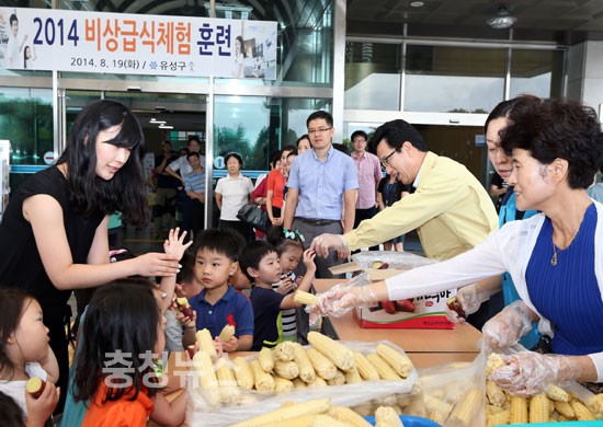 유성구는 19일 구청 현관에서 2014 을지훈련의 일환으로 비상급식체험 훈련을 실시한 가운데 훈련에 참가한 우리어린이집 한 아이가 허태정 유성구청장으로부터 고구마를 받고 있다.