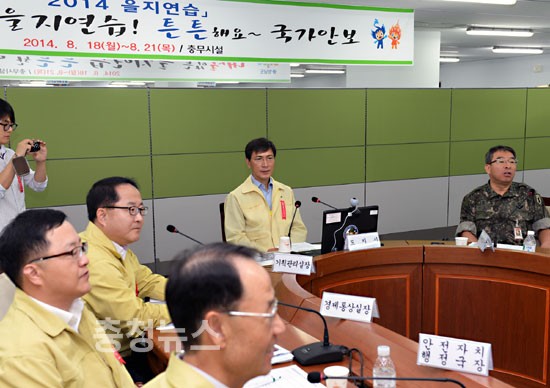 충남도는 19일 2014 전시종합상황실에서 도와 군부대 관계자 등이 참석한 가운데 안희정 충남지사를 연습장으로 하는 을지연습 일일상황보고와 전시주요현안과제 토의를 실시했다고 밝혔다.
