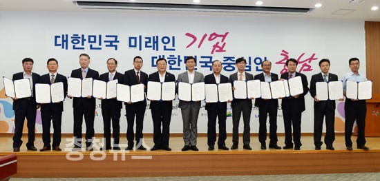 안희정 충남도지사가 22일 도청 대회의실에서 한아테크㈜ 등 7개 기업 대표, 김석환 홍성군수 등 4개 시‧군 시장‧군수 등과 합동 투자협약(MOU)을 체결하면서 신도시 활성화에 대한 기대의 목소리가 크다.