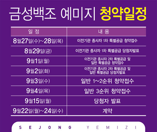 금성백조 세종예미지는 27일 수요일 이전기관 종사자 1차 특공을 시작하여 오는 28일 목요일까지 1차 특별공급 신청접수를 받는다. 전체 672세대 가운데 세종시 이전 중앙부처 공무원 및 정부 출연기관 직원에 50% 특별 분양(336세대)을 하고 나머지 50%를 일반 분양하게 된다.