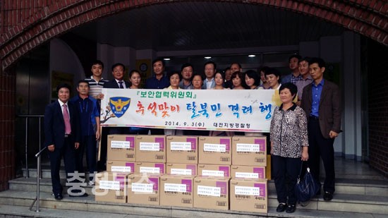 대전경찰청(청장 최현락)은 3일 월평동 주공아파트에서 보안협력위원회와 합동으로 탈북민 30명을 초청, 추석 한가위를 앞두고 따뜻한 사랑나눔 추석선물을 전달하고 격려했다.