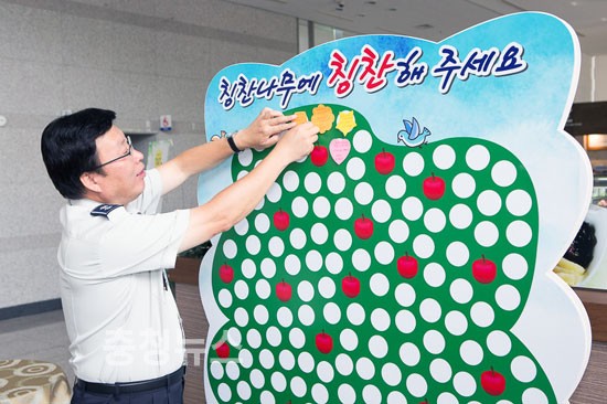 대전지방경찰청장(청장 최현락)은 12일 대전경찰청 1층 현관에서 지휘부 및 전 직원들이 참여한 가운데, 칭찬하는 직장문화를 조성하기 위해 ‘칭찬나무’를 설치, 칭찬직원을 스티커에 작성하고 칭찬나무에 부착·추천하는 행사를 개최했다.