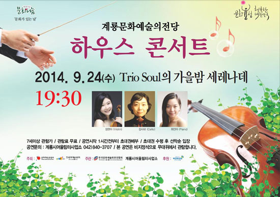 문화가 있는 날 지원프로그램으로 추진되는 하우스콘서트 ‘트리오 소울(Trio Soul)의 가을밤 세레나데’ 공연이 오는 24일 오후 7시 30분 계룡문화예술의전당에서 열린다.