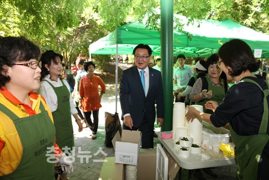 계룡시여성단체협의회(회장 김숙영)는 16일 엄사면 엄사1호 공원에서 최홍묵 시장을 비롯한 300여명이 참여한 가운데 어려운 이웃을 돕기 위한 ‘사랑 나눔 바자회’를 개최했다.