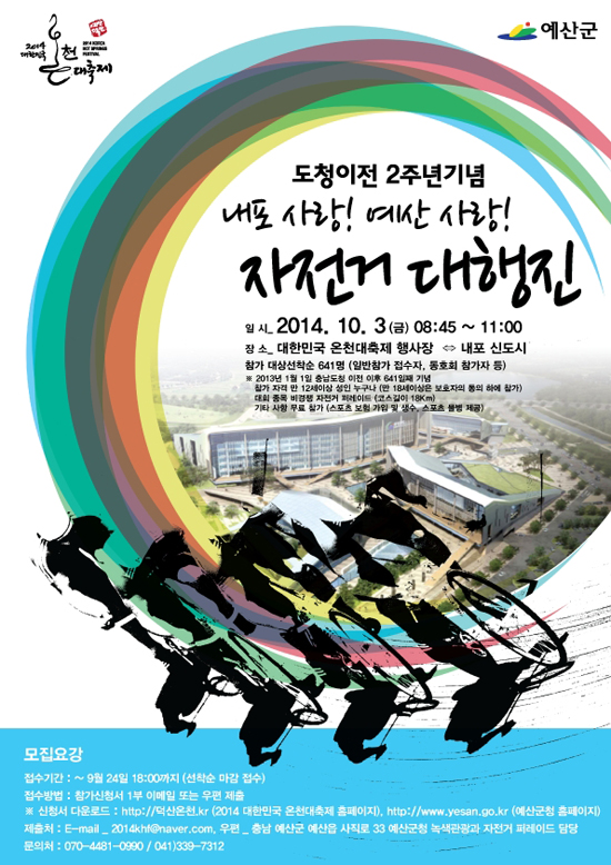 ‘내포사랑! 예산사랑! 자전거대행진’은 2014 대한민국 온천대축제의 성공적 개최와 내포신도시 충남도청 이전 2주년을 맞아 이를 기념하기 위해 마련됐다.