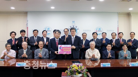 목원대(총장 박노권)는 17일 본부 회의실을 방문한 목원대학교회(담임목사 김홍관)로부터 3천만원의 지정발전기금을 기탁받았다.