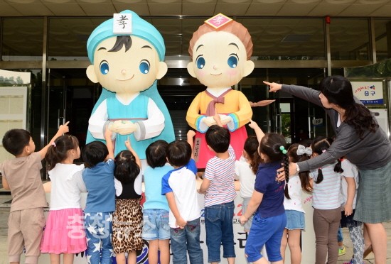 중구(구청장 박용갑)는 제6회 대전효문화뿌리축제의 성공적인 개최를 기원하기 위해 중구청 현관에 효도령 & 효낭자 캐릭터를 활용한 홍보등을 설치해 본격적인 효문화뿌리축제 분위기 조성에 나섰다.