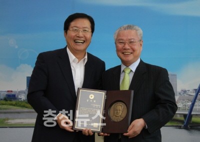 ▲ (주)금성백조주택 정성욱 회장이 지난 19일 장종태 청장으로부터 지역사회 발전 기여로 감사패를 수여받았다.