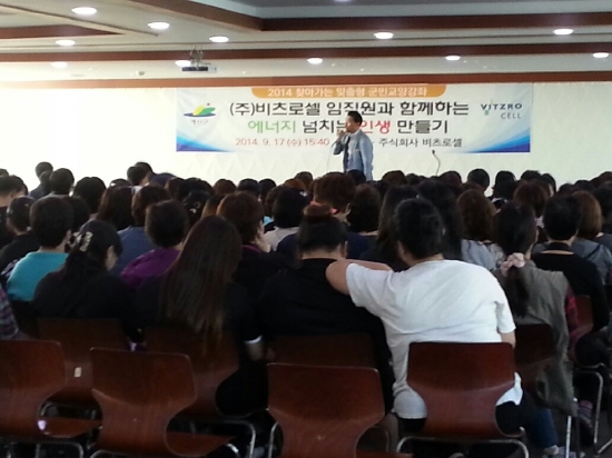 곽동근 에너지프렌드 대표가 강사로 나서 ‘에너지 넘치는 인생 만들기 프로젝트’라는 주제로 강의를 진행했으며, 특히 (주)비츠로셀에서는 직원들의 교육 참석을 위해 생산공정을 중단하는 등 임직원들의 활기찬 직장생활 및 직장스트레스 해소를 위한 열의를 보였다.