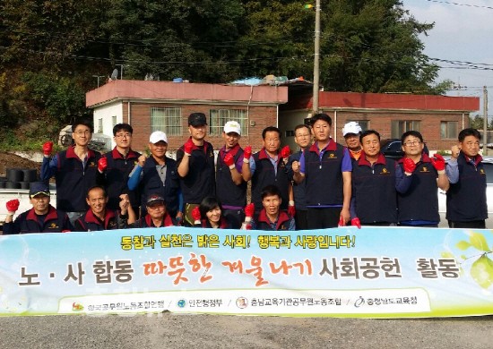 충남도 교육청(교육감 김지철)은 27일, 한국공무원노동조합연맹(위원장 구춘송) 주관으로 안전행정부(장관 정종섭), 충남교육청 소속 직원 및 조합원 40여명과 함께 예산관내 독거노인 자택에서 노·사 합동 따뜻한 겨울나기 사회공헌 봉사활동을 펼쳤다.
