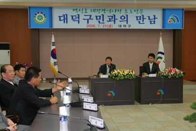 박 시장은 주민에게 "대덕구가 소외됐다는 말을 많이 들었다"면서 "주민 참여 없이는 아이디어도 없고 공감대 형성도 없어 업무추진이 어렵고, 주민이 참여하는 행정이 진정한 자치행정이 아닌가 싶다"며 도움을 청했다.