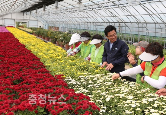 ▲ 허태정 유성구청장이 유성구 양묘장을 방문해 관계자들의 노고를 격려하고, 재배 중인 국화꽃을 둘러보고 있다.