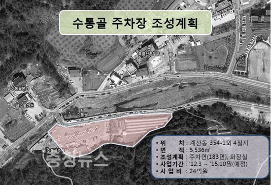 유성구가 추진하는 수통골 주차장 조성 사업이 호재를 만났다. 당초 부지매입비와 시설비 등 시·구비 각 50%씩 총 24억 원이 반영됐는데, 이중 농림부 소유의 부지 1,796㎡가 무상귀속키로 협의됨에 따라 예산 12억 원을 절감하게 됐다.